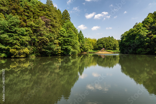 japan, summer, landscape, verdure, reflections, nature, blue skies, mere, green, sunny, sky, wood, tourist attraction, plant, tour tourism, water surface, cloud, green, park, water, open air, forest, forest, showplace, light, leaf, grove, travel, view, copy space, lake, garden, garden, stream