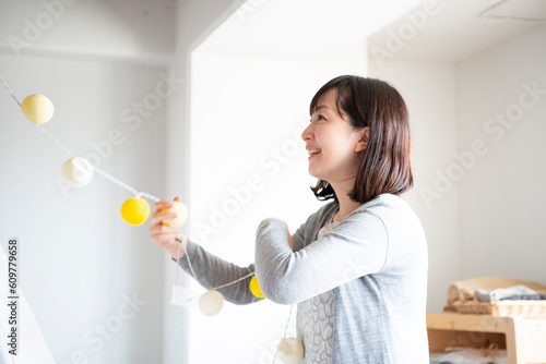 家の中で飾り付けをしている女性