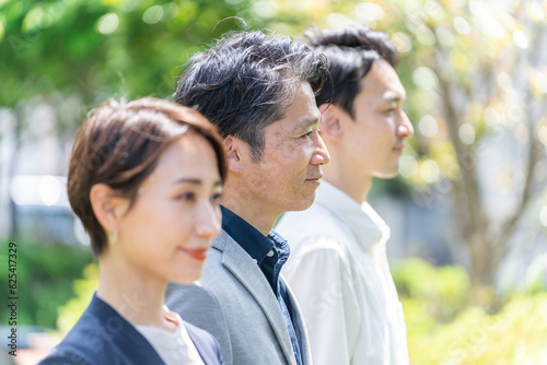 business, businessman, casual, man, woman, profile, smile, hustle, aim, success, achievement, ambition, ambition, diversity, 30s, 50's, middle-aged, japanese, asian, suit, jacket, salaried employee, employee, open air, salesman, trip, work, manpower, lineup, verdure, green, people