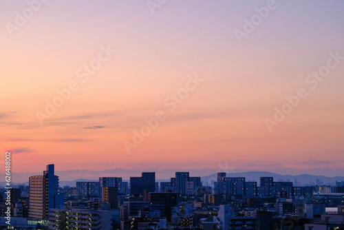 都市の夜明け前。太陽が昇る前に東の空がオレンジ色に輝くマジックアワー。
