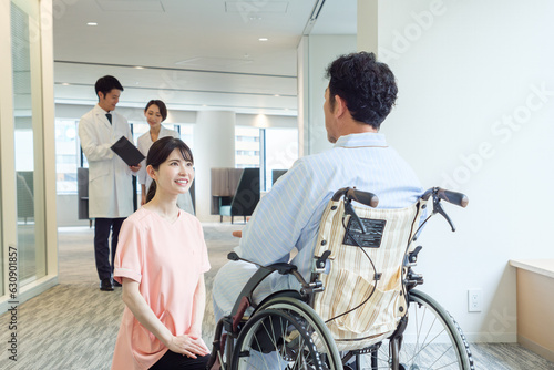 hospital, nurse, nurse, helper, nurse, patient, wheelchair, physical therapist, conversation, consultation, woman, man, chat, story, speaking, hall, office, doctor, doctor, doctor, medical care, surgery, assistance, care, care worker, nursing home, care, support, wheelchair, nursing home, aged, work, work, welfare, young, 30s, middle-aged, aged, japanese, asian