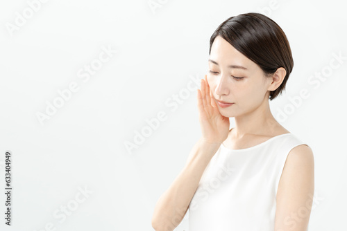 woman, portrait, skincare, beauty, cosmetic, japanese, people, smile, waist up, young, hand, 30s, health, beauty, lovely, este, white background, clean, middle-aged, joyful, supplement, diet, facial, skin, cheek, bare skin, make-up, face, toilet water, latex, relax, profile