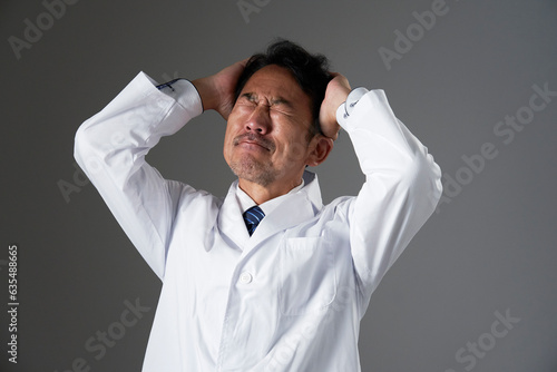 doctor, doctor, man, labcoat, medical care, drop, apprehension, sad, pressure, repentance, unrest, japanese, trouble, shirt, depression, cravat, asian, middle-aged, 50's, dark, gloom, aged