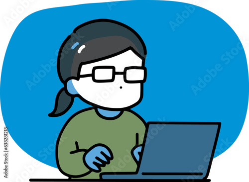 personal computer, woman, glasses, woman, people, person, japanese, illustration, personal computer, notebook, work, working, young, 30s, dark, night, gloom, homemaker, vector, handwriting, cartoon, manga, cartoon, sweet, loose, asian