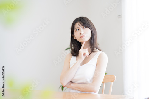 contemplate, skincare, cosmetic, young, mirror, 30s, sunblock, dryness, apprehension, drop, stress, people, japanese, long hair, bind up, indoor, indoor, fold, slack, breakout, bear, negative, acne, tan, cheek, waist up, hand, homemaker, beauty, hand mirror, woman, hesitate