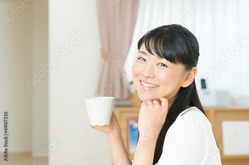 woman, lifestyle, coffee, japanese, smile, young, break, refreshing, mug, chinese, korean, indoor, casual, live, 30s, table, white, room, natural, loosen up, ease, relax, asian, taiwanese