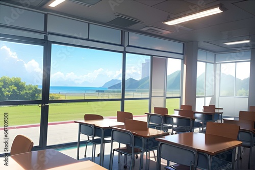 classroom, school, schoolhouse, junior high, high school, high school, table, chair, room, architecture, evening, daytime, landscape, view, scene, background, game, illustration, motion picture, animation, cartoon
