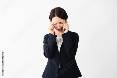 portrait, people, person, woman, woman, japanese, japan, young, 30s, business, office, work, job, smartphone, smartphone, mobile, call, hand, call, conversation, speaking, contact, communication, incoming, contemplate, cry, sad, mourn, shock, tragic, negative, cool, cool, elegant, smart, stand, indoor, white background, copy space, white