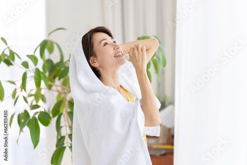 woman, morning, towel, toothbrush, middle-aged, routine, japanese, asian, people, person, shower, teeth, polish, health, lifestyle, dry, wipe, bath towel, homemaker, 30s, clean, skincare, face, skin, health spa, beauty, woman, bathe, cosmetic, healthy, wellness, health, live, room, cosmetic, beauty, hair, hair, relaxation, window