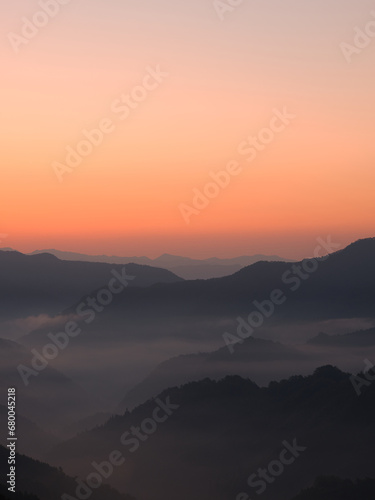 sunset, mountain, landscape, sunrise, sky, nature, fog, sun, morning, cloud, blur, morning, hill, evening, horizon, view, depression, tonight, forest, lovely, misty, orange