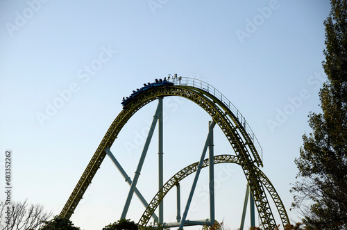 roller coaster, coaster, park, attraction, person, ride, leisure, daytime, shadow, sky, blue skies, speed, landscape, japan, yellow, silhouette, white, wood, branch, amusement, metal, fun, funfair, black