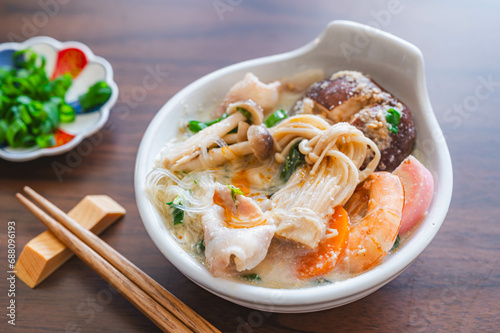 casserole, pot, meal, mushroom, green onion, health, winter, warm up, diet, cosmetic, vegetable, chopstick, dinner, food, food, pork, pork, miso, liqueur, soy sauce, delicious, table, seafood, handcraft, up, japan, photo
