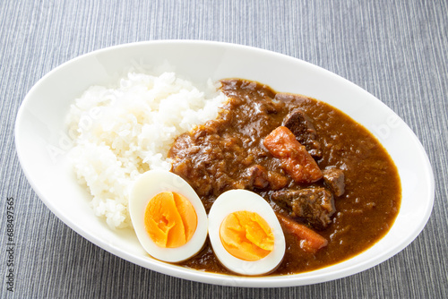 boiled egg, egg, curry, rice, topper, dish, boiled egg, cross section, rice, food, rice, yolk, meal, food, food, food, dish, dish, table, indoor, indoor
