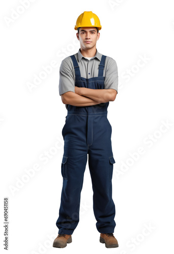 建設労働者の男性。腕を組んでいる。ヘルメット、ジーパン