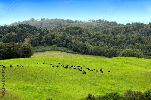 高原で草を食(は)む黒い牛たち
