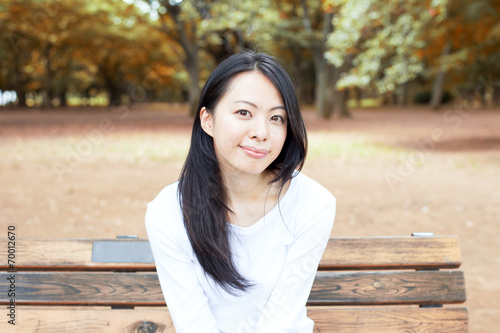 woman, girl, park, fall, season, open air, outdoors, seated, bench, break, rest, look, walk, nature, wood, leaf, forest, natural, carefree, relax, sweet, smile, beauty, black hair, young, people, portrait, japanese, asian, student, casual, contemplate