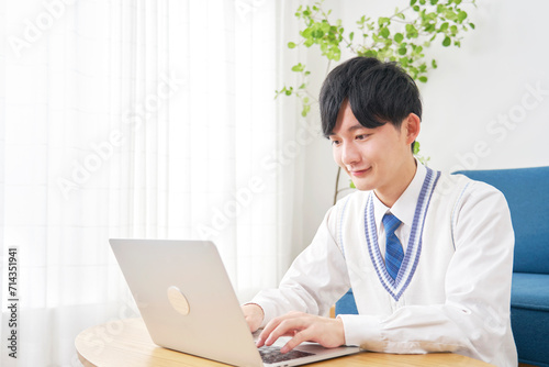 notebook, spend, home, cyberspace, typing, man, uniform, mail, boy, living room, man, search, room, vest, cravat, keyboard, input, shirt, boy, young, house, personal computer, alone, japanese, indoor, net, indoor, asian, teenage