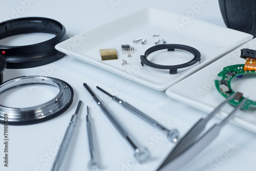 digital camera, camera, lens, dissolution, cleaning, checking, fix, working, precise, instrument, screw, screw, driver, forceps, blower, dish, art, art, design, japan, black, white, silver, silver, object, mono, good, product, up, closeup, macro, copy space, background, wallpaper, material, texture, white background