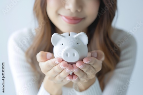 豚の貯金箱を持つ日本人女性(貯金・投資・背景なし)