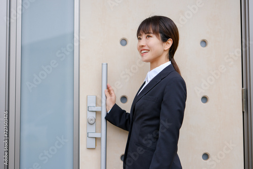 woman, japanese, door, suit, open, hall, businessman, young, portrait, person, lovely, smiling, beauty, standing, happy, smile, face, lady, look, outside, 1, come home, attendance, eastern, waist up, brunette, house, depart, office, people, student, open, smile, door, business, visit