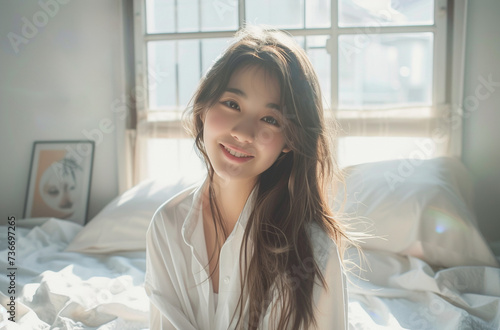 her, girl, indoor, bed, japanese, light, bedchamber, people, waist up, woman, smile, shirt, t-shirt, shirt, full-length, happy, room, new life, pretty, pajama, morning, cohabitation, sheet, sleep, beauty, cosmetic, vacation, asian, light, drape, woman, portrait, smile, lifestyle, relax, pretty, live, window