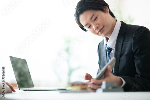 japanese, people, man, businessman, property, realtor, business, suit, young, office, work, indoor, indoor, waist up, smile, work, copy space, asian, portrait, proposal, refer, customer service, seated, table, tablet, screen, notebook