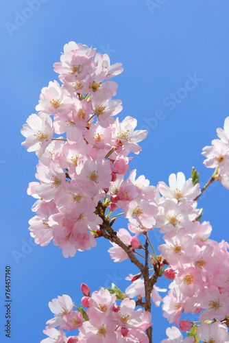 青空に映える満開の思川桜のクローズアップ 青空背景