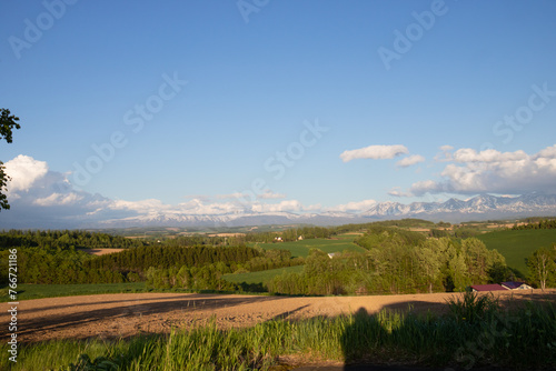 spring, landscape, hill, hill country, field, cultivation, tillage, green, green, wood, grove, coppice, mountain, mountain chain, sky, blue skies, blue, cloud, open air, nature, sunny, japan, view, farming, copy space
