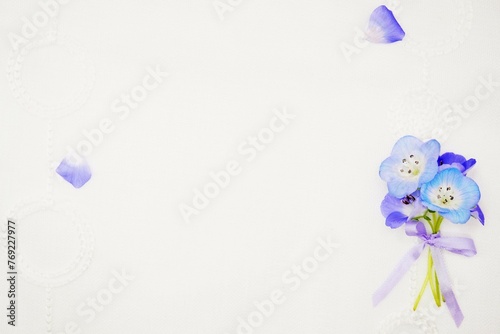 白背景に薄紫のリボンで束ねられたネモフィラの花束と花びらののシンプルなフレーム素材