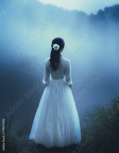 悲しみの底、喪失、霧の中を彷徨う心情をイメージした女性の後ろ姿