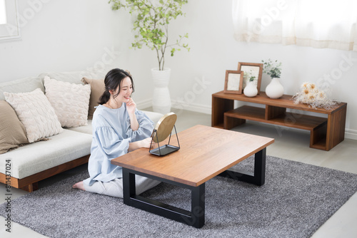 woman, skincare, skin, cosmetic, sweet, smile, people, japanese, cheek, pretty, joyful, young, lifestyle, room, indoor, relax, indoor, beauty, copy space, casual, seated, mirror, portrait, couch, waist up, house, light, home, 30s, girl, beauty, asian, relax, couch, home, hand, touch, table