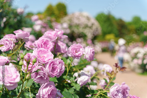 rose, pink, purple, lilac, rose, flower, rose garden, rose garden, flowerbed, view, landscape, flower petals, nature, sunny, leaf, green, rose, garden, garden, garden, lovely, plant, park, spring, copy space, background, material, light, gardening, gardening, image, open air, outside, flowering, may, rambler rose, closeup, up, blue, sky
