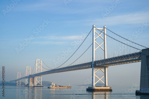 freighter, bridge, boat, japan, seto inland sea, architecture, okayama, landmark, sea, travel, transportation, suspension bridge, landscape, pier, shikoku