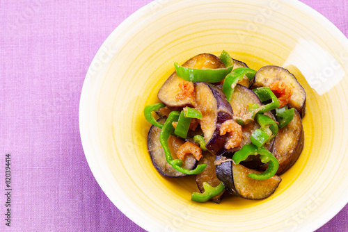 aubergine, green pepper, shrimp, ginger, miso, cooking oil