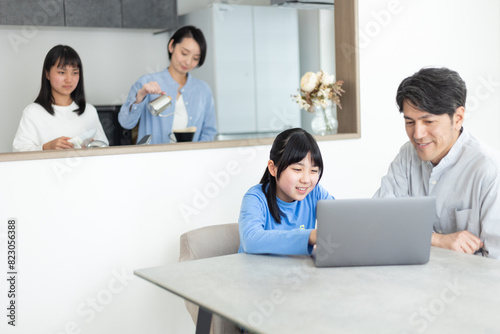 people, japanese, woman, man, family, couple, father, mother, daughter, children, sister, 30s, spring, examine, search, cyberspace, online, notebook, personal computer, portrait, seated, indoor, house, table, kitchen, help, housekeeping, smile
