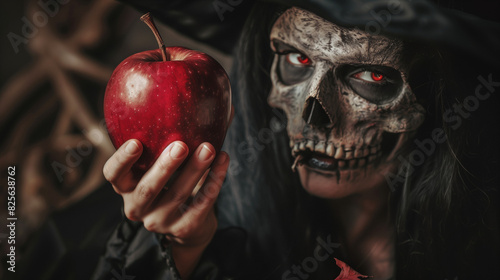髑髏の形をした邪悪な毒林檎を持った邪悪な魔女