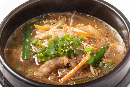 pot, food, casserole, beef, soup, spicey, hot pepper, dish, chili pepper, chilies, meal, bean sprouts, condiment, indoor, menu, image, material, carrot, carrot, white background