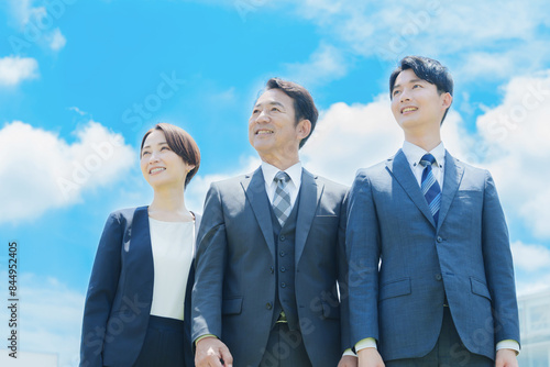 man, woman, businessman, portrait, blue skies, sky, open air, look up, open air, cloud, sunny, team, group, business, boss, secondary, colleague, newcomer, executive, president, employee, salaried employee, career woman, ol, suit, cravat, recruit, carrier, outdoors, smile, 50's, three people, plural, japanese, asian