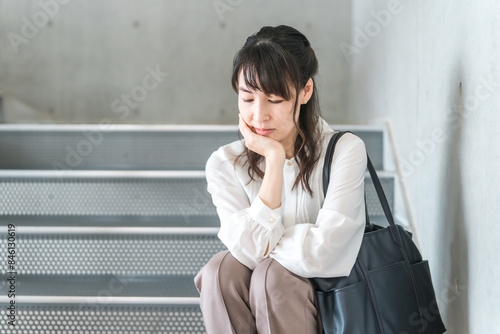 trouble, apprehension, flop, drop, contemplate, woman, disapproval, solitude, tease, repentance, stress, unrest, apathy, burnout, pressure, instability, relationship, tire, fatigue, overwork, spicey, depression, office, ol, manager, work, work, mental health, seated, staircase, downsizing, retire, depression, middle-aged, japanese, asian, people