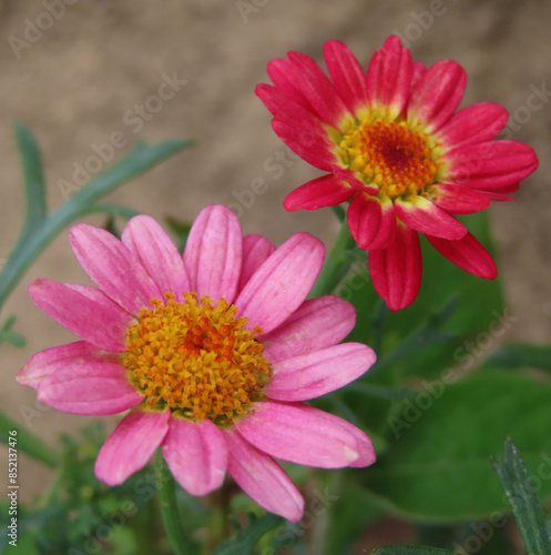 日本で六月にマーガレットがピンク色の花を咲かせています