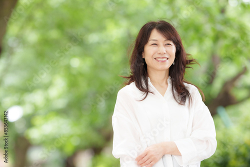 woman, alone, japanese, people, open air, este, joyful, morning sun, verdure, copy space, morning, green, smile, lifestyle, sweet, spring, summer, sunbath, relax, smile, smile, vacation, portrait, stretching, casual, health, health care, yoga, 50's, asian, outdoors, active, training, middle-aged