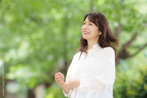 woman, alone, japanese, people, open air, este, joyful, morning sun, verdure, copy space, morning, green, smile, lifestyle, sweet, spring, summer, sunbath, relax, smile, smile, vacation, portrait, stretching, casual, health, health care, yoga, 50's, asian, outdoors, active, training, middle-aged
