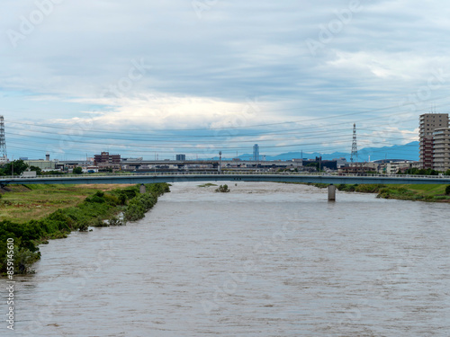 stream, river, bank, cloudburst, bridge, japan, town, town, city, city landscape, view, landscape, vision, view, summer, cloud, water, water damage, open air, water surface, unmanned