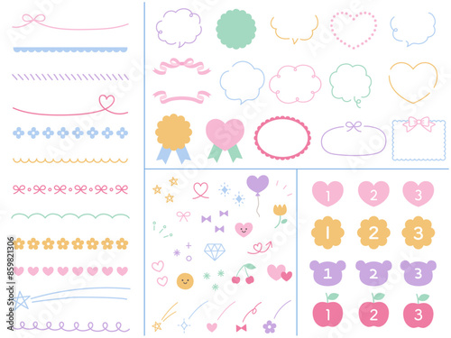 ガーリーな飾りイラストのベクターイラストセット フレーム ハート 花 吹き出し 数字 リボン