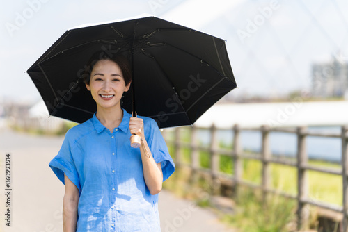 portrait, people, person, woman, woman, japanese, japan, asia, asian, young, young, 30s, black hair, short hair, blue, sky blue, parasol, umbrella, walk, walk, summer, hot, hand, positive, smile, smile, tan, sunblock, sunblock, green, nature, grass, wood, route, sidewalk, promenade, open air, outside, copy space, lifestyle