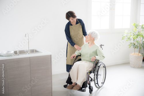 wheelchair, aged, aged, care, woman, family, family, home, support, support, smile, people, japanese, aged, lifestyle, seated, asian, indoor, nanny, apron, nurse, welfare, elderly, nursing home, helper, copy space, indoor, 60's, waist up, nursing home, care worker, two people, daughter, mother, medical care