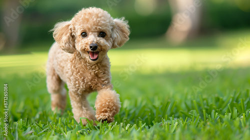 ペット 犬 背景 トイプードル 芝生 スマイル お散歩 レジャー アウトドア コピースペース