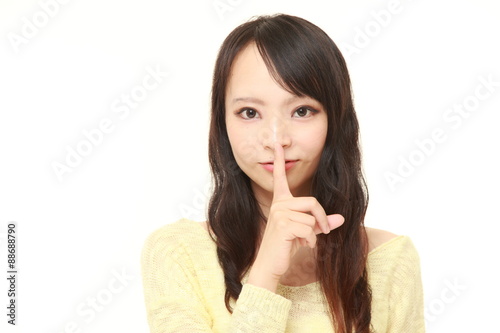calm, silence, quiet, stillness, secret, stealth, secret, confidentiality, woman, sky blue, japanese, asian, alone, white background, woman, long hair, young, yellow, skeletal, smart, slim