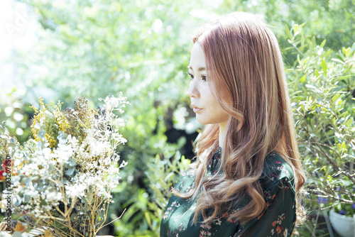 plant, surround, bouquet, possess, woman, business, person, japanese, face, lovely, relax, sweet, light, portrait, long hair, pursuit, lifestyle, flower, white, nature, young, sunny, expression, green, asian, green, plant, arrangement, bind up, dead, vivid, clean, closeup, refreshing, pupil, floral, hair, beauty, happy, indoor