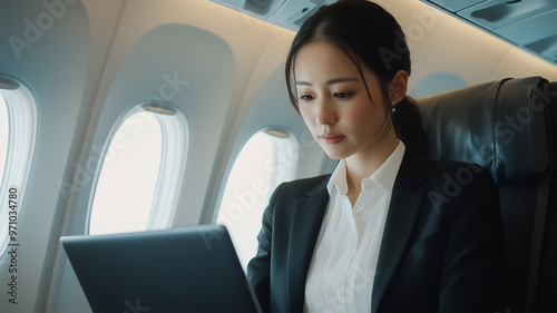 japanese, woman, plane, work, minimalist, focal point, smile, professional, travel, calm, experienced, departure, liberty, environment, nature, health, light, pleasant, aim, confidence, vision, smart, glamour, energy, preparation, inspiration, grow, strength, development, calm, intent